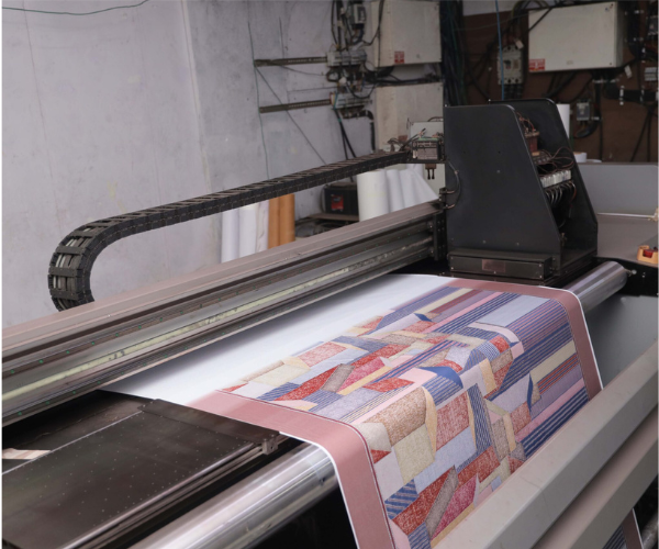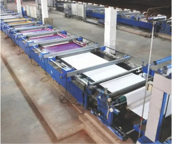 Semi-continuous process with slower speeds (15-25 yards per min. Advantages:- Cost-effective, versatile, long-lasting prints, various inks and effects